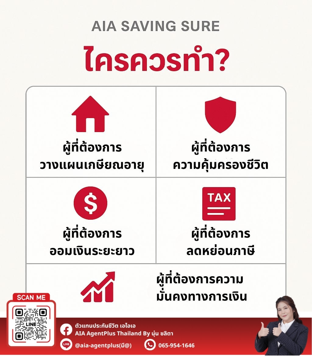 AIA Saving Sure คือ แผนประกันชีวิตแบบสะสมทรัพย์ที่ออกแบบมาเพื่อการออมเงินอย่างมีวินัยในระยะยาว โดยให้ทั้งความคุ้มครองชีวิตและผลตอบแทนทางการเงิน ผู้เอาประกันจะได้รับเงินคืนเป็นระยะระหว่างที่กรมธรรม์มีผลบังคับ และจะได้รับเงินก้อนใหญ่เมื่อครบกำหนดสัญญา นอกจากนี้ยังให้ความคุ้มครองกรณีเสียชีวิต ช่วยให้ครอบครัวมีความมั่นคงทางการเงินในกรณีที่เกิดเหตุไม่คาดฝัน