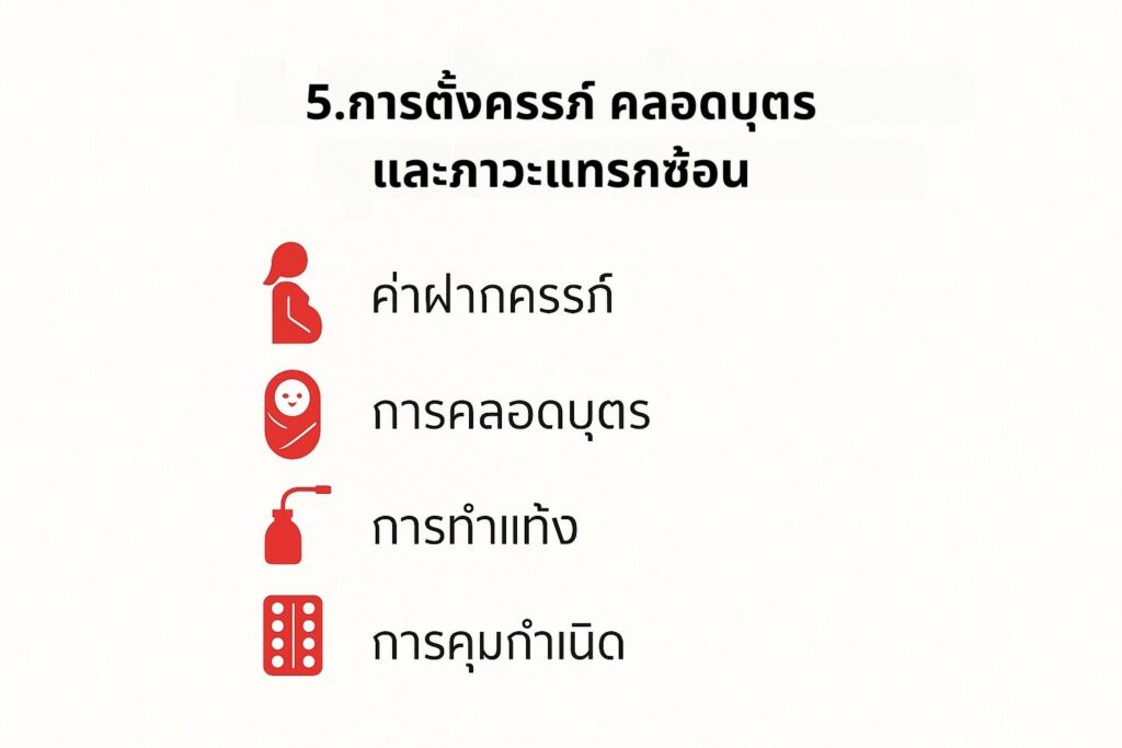 ครอบคลุมไปถึงค่าใช้จ่ายในการฝากครรภ์ การคลอดบุตร การทำแท้ง การคุมกำเนิด หรือภาวะแทรกซ้อนใด ๆ ที่เกี่ยวข้องกับการตั้งครรภ์ เช่น ภาวะครรภ์เป็นพิษ หรือการคลอดก่อนกำหนด โดยทั่วไปแล้ว การประกันสุขภาพพื้นฐานจะไม่ครอบคลุมค่าใช้จ่ายเหล่านี้ ยกเว้นกรณีที่ผู้เอาประกันได้ซื้อ “สัญญาเพิ่มเติมคุ้มครองการคลอดบุตร” ซึ่งออกแบบมาเฉพาะสำหรับดูแลด้านการตั้งครรภ์และการคลอด