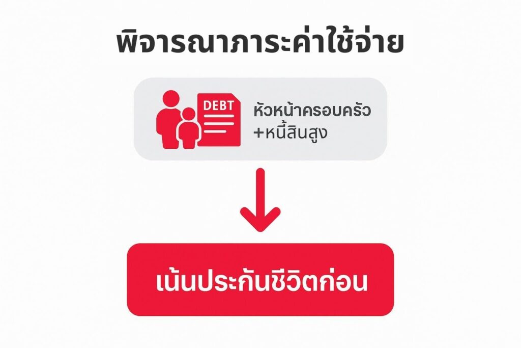 หากคุณเป็นหัวหน้าครอบครัว และมีผู้อยู่ในความดูแล รวมถึงมีภาระหนี้สินสูง คุณควรเน้นที่ประกันชีวิต ก่อน เพื่อให้แน่ใจว่าจะมีเงินก้อนเพียงพอทดแทนรายได้ที่ขาดหายไป หากเกิดเหตุไม่คาดฝันกับคุณ