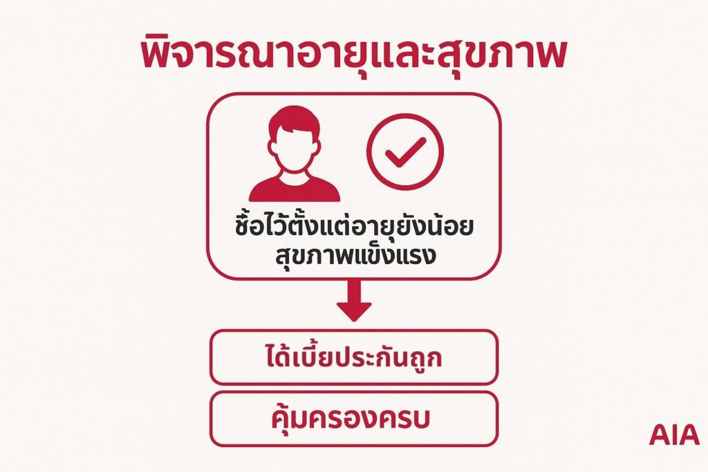 การซื้อประกันสุขภาพ ควรทำตั้งแต่อายุน้อยและสุขภาพยังแข็งแรง เพื่อให้ได้เบี้ยประกันที่ถูกและมีโอกาสได้รับความคุ้มครองที่สมบูรณ์ ในขณะที่ประกันชีวิต ก็ควรทำตั้งแต่เนิ่น ๆ เช่นกัน เพื่อล็อกอัตราเบี้ยที่ต่ำกว่า