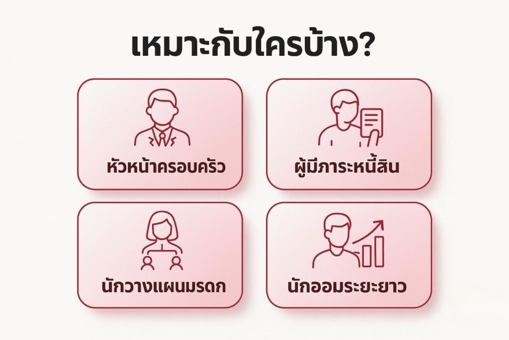 - ผู้ที่ต้องการออมเงินระยะยาว โดยเฉพาะแบบสะสมทรัพย์และแบบบำนาญเพื่อเตรียมเงินเกษียณ
