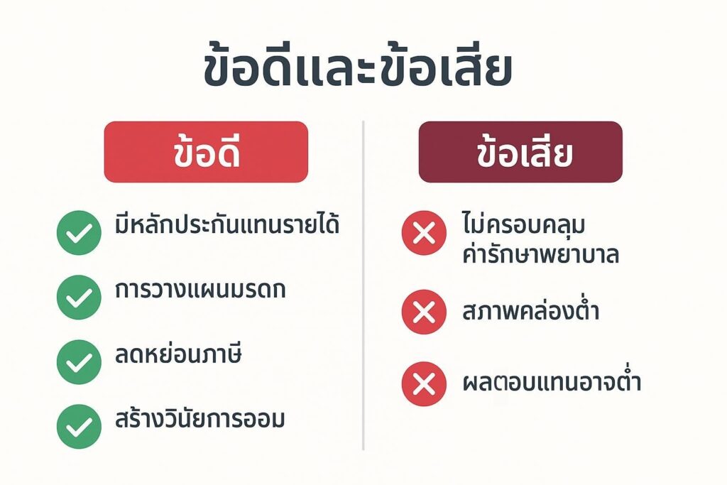 - เป็นหลักประกันรายได้ทดแทน ช่วยสร้างความมั่นคงทางการเงินให้ครอบครัว หากผู้หารายได้หลักเสียชีวิต