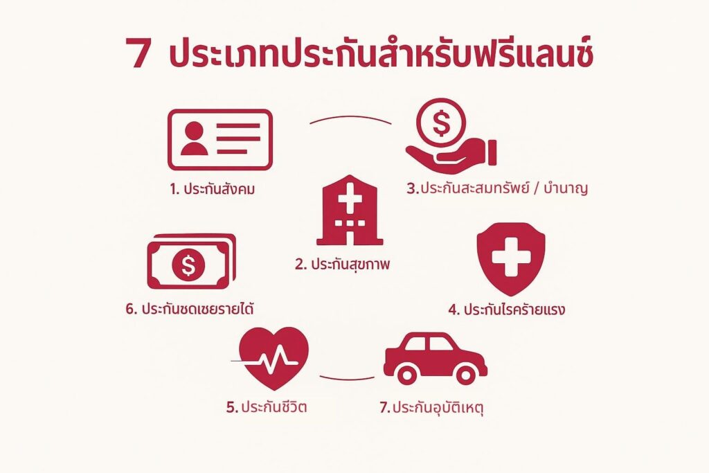 สำหรับฟรีแลนซ์ที่ต้องการสร้างหลักประกันทางการเงินอย่างรอบด้าน ควรเลือกทำประกันหลายประเภทเพื่อมาเติมเต็มความเสี่ยงที่ขาดหายไปจากสวัสดิการ โดยมี 7 ประเภทที่แนะนำดังนี้