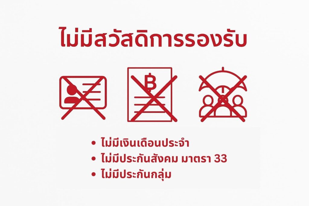 - ฟรีแลนซ์ไม่มีประกันสังคมมาตรา 33 หรือประกันกลุ่ม ซึ่งเป็นสวัสดิการหลักที่คุ้มครองค่ารักษาพยาบาลและชดเชยรายได้เมื่อเจ็บป่วย ทำให้ต้องรับผิดชอบค่าใช้จ่ายเองทั้งหมด